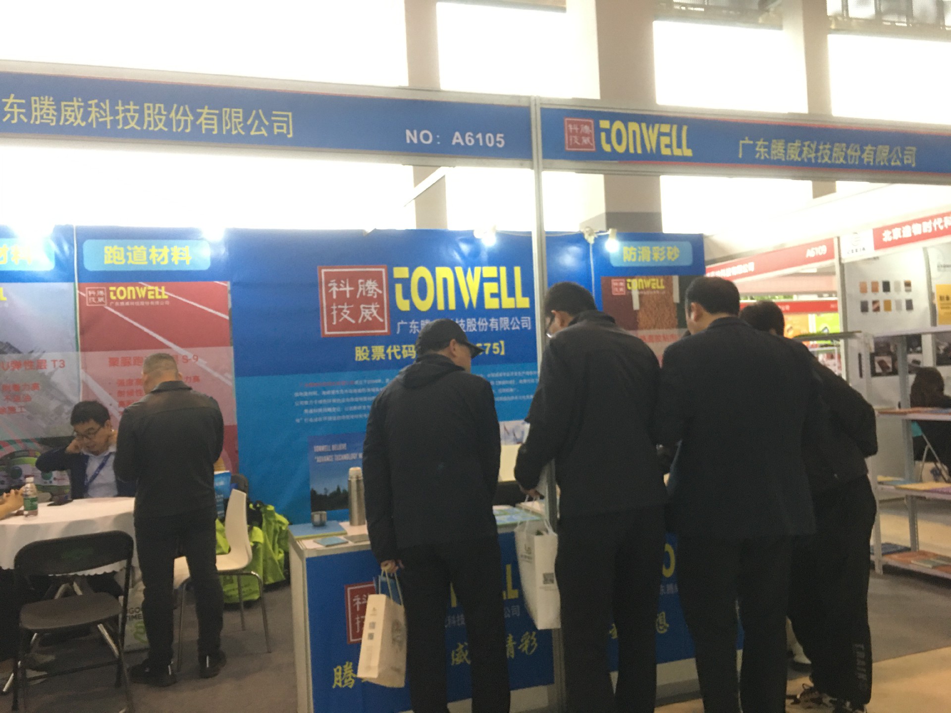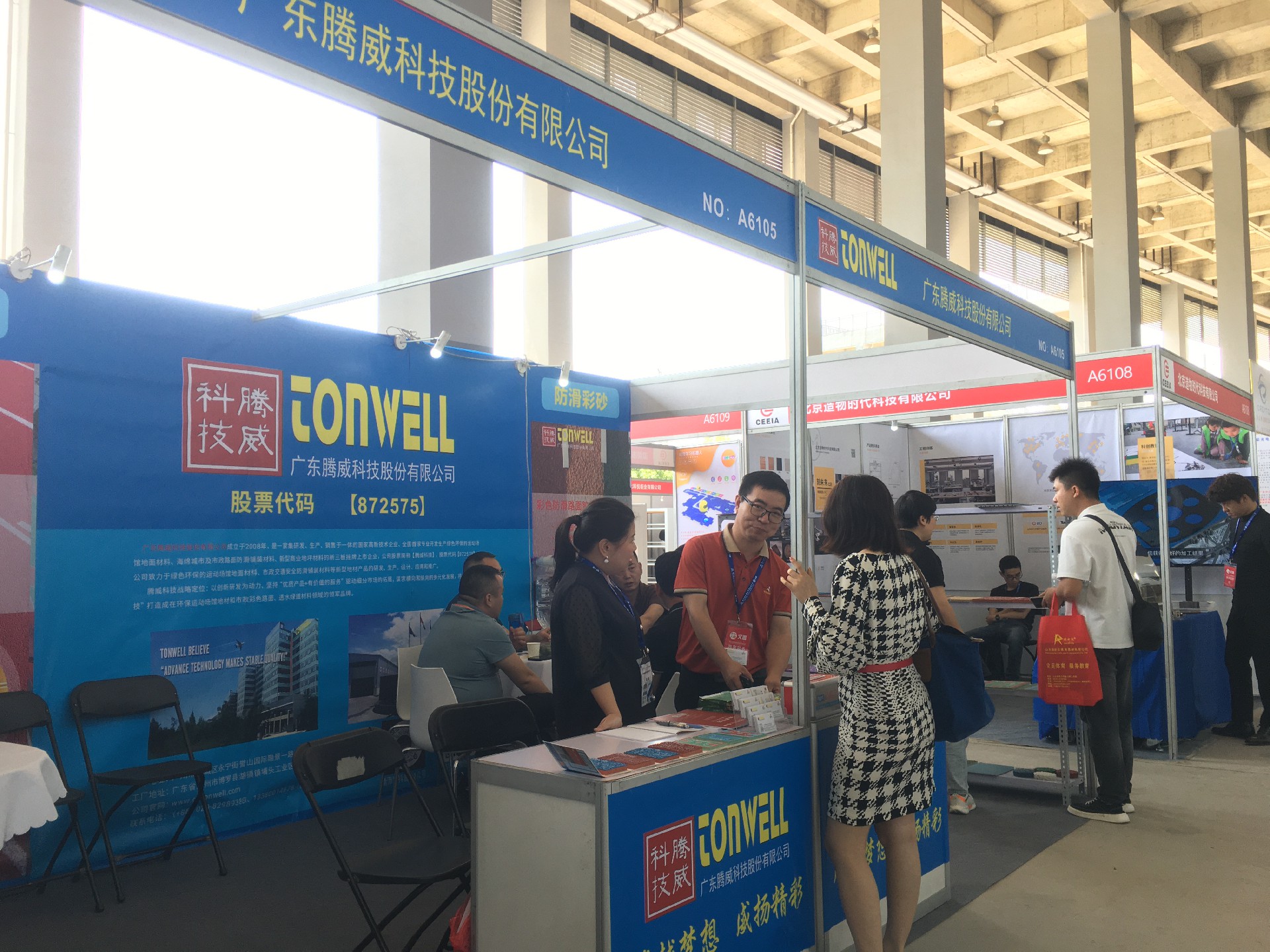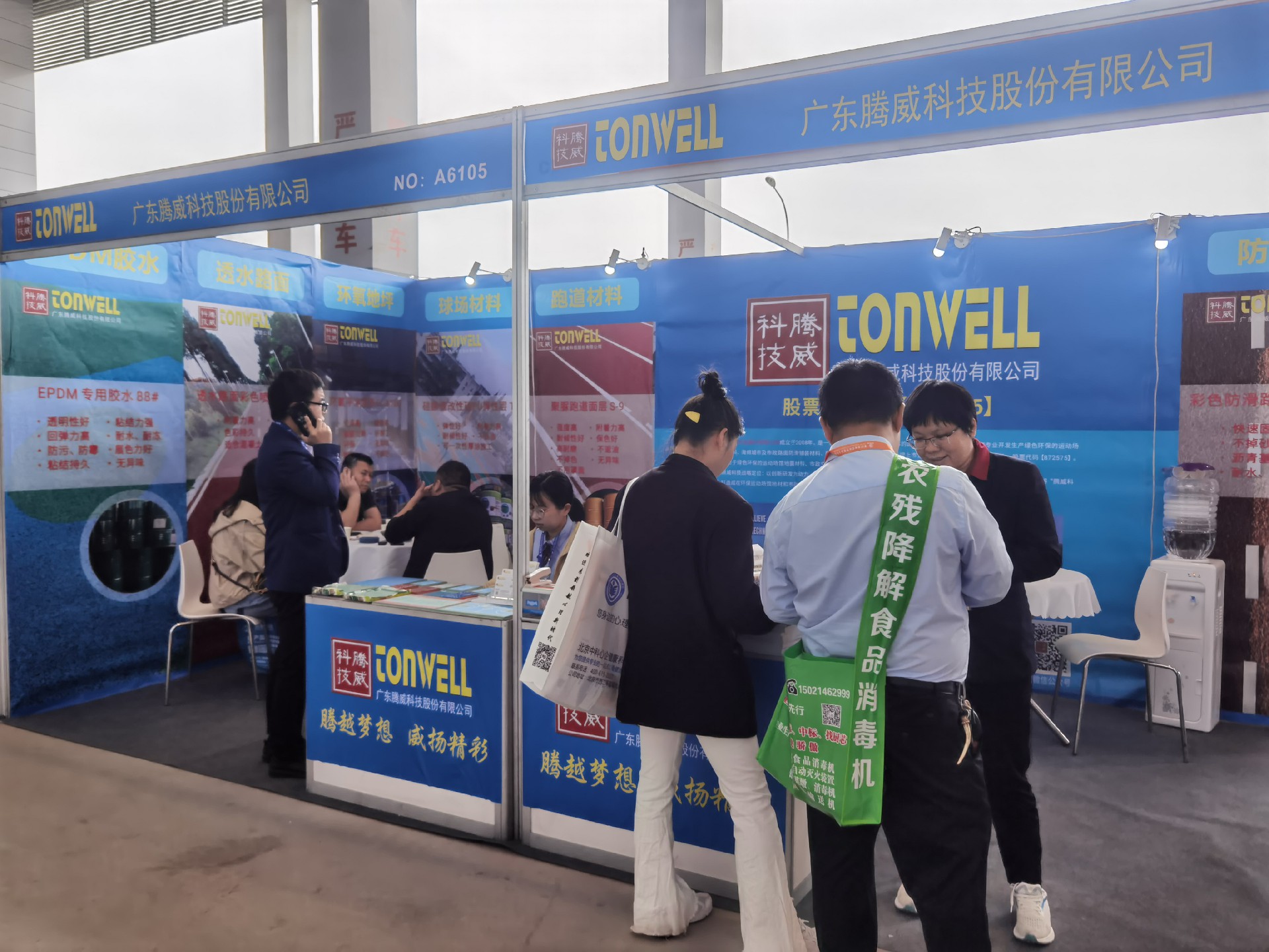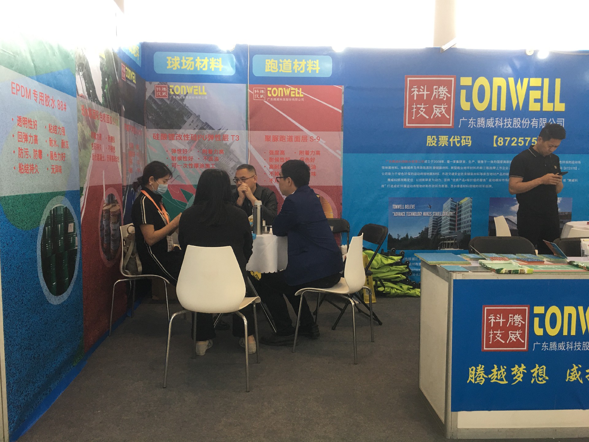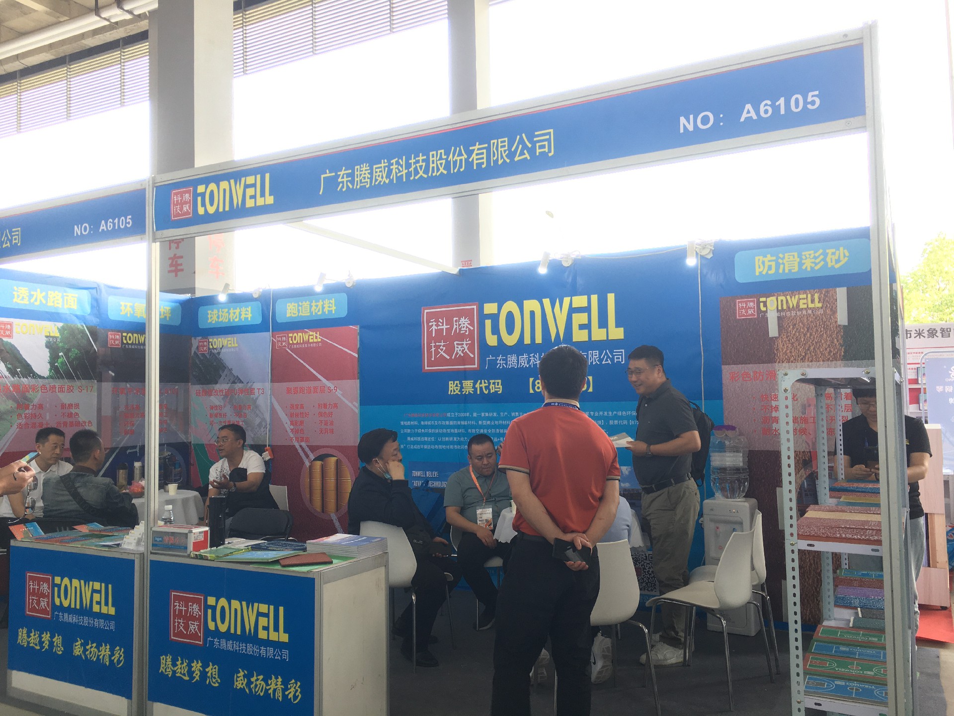 廣東騰威科技攜帶運動場館地面材料、市政彩色防滑路面、工商業地坪材料三大鋪裝體系產品亮相本次展會。
